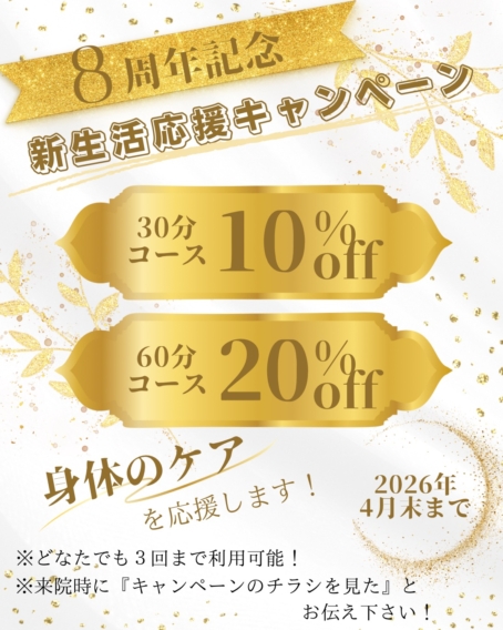 【8周年イベント開催】 \新生活応援キャンペーン/ いつもありがとうございます! 感謝の気持ちを込めて、 特別キャンペーンを実施します 30分コース →【10%OFF】 60分コース →【20%OFF】 さらに… どなたでも【3回までOK】 新生活で疲れやすいこの時期、 身体を整えて最高のスタートを切りましょう ご来院の際に 「キャンペーンチラシを見た」とお伝えください! 期間:4月末まで ご予約お待ちしております